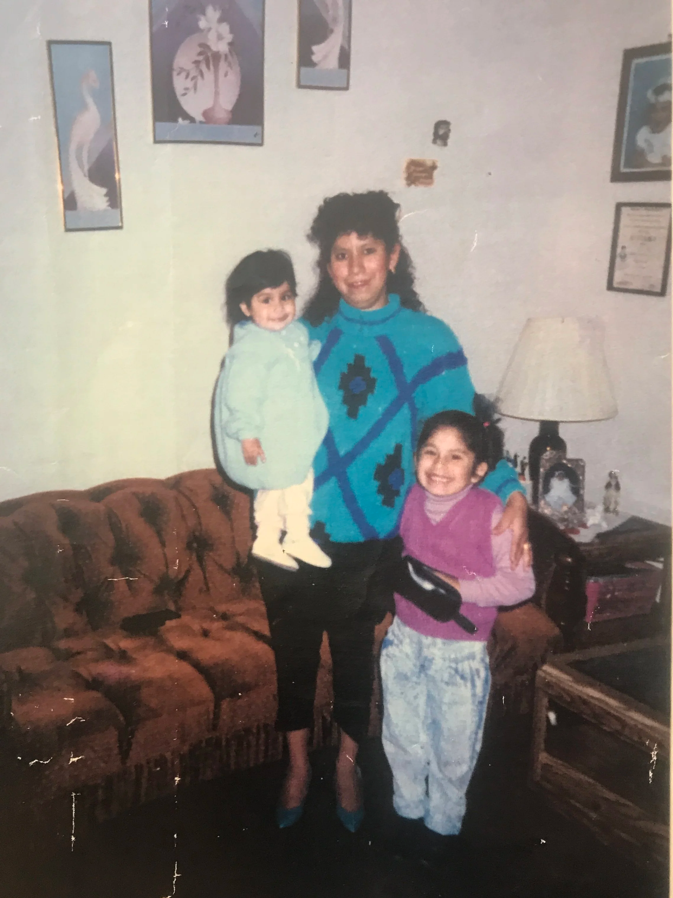 In second grade, my father finally left us. My mother worked too many jobs and began taking evening classes at our community college. Tia Norma, my mom’s youngest sister, who felt more like my older sister, moved in with us. Tia Norma had just graduated high school and attended community college with my mom. Her youthful spirit was palpable- she talked really fast, and moved in big dramatic gestures. Like my mother, Tia Norma was also a runner, but unlike my mother her English was really good. We lived in an all-girl house and it was so much fun. To make ends meet, my mom, Tia Norma, my sister and I would re-sell used items at the Swap Meet. On Saturdays we would wake up early and head to the yard sales in wealthy neighborhoods to buy goods that could be re-sellable. Things like used Nintendo’s, TV’s, and VCR’s were highly sought after and made enough money to meet our grocery quote for the week. On Sundays we would make the two-hour drive to the Nipomo Swap-Meet. During those long drives, my sister and I sat in the back while our mother drove our light blue, 1986 Chevy Nova, packed to the brim with all our goods, while my Tia Norma Dj’d from the passenger’s seat, blasting Pandora’s Juan Gabriel Medley.” At the top of our lungs we all sang: